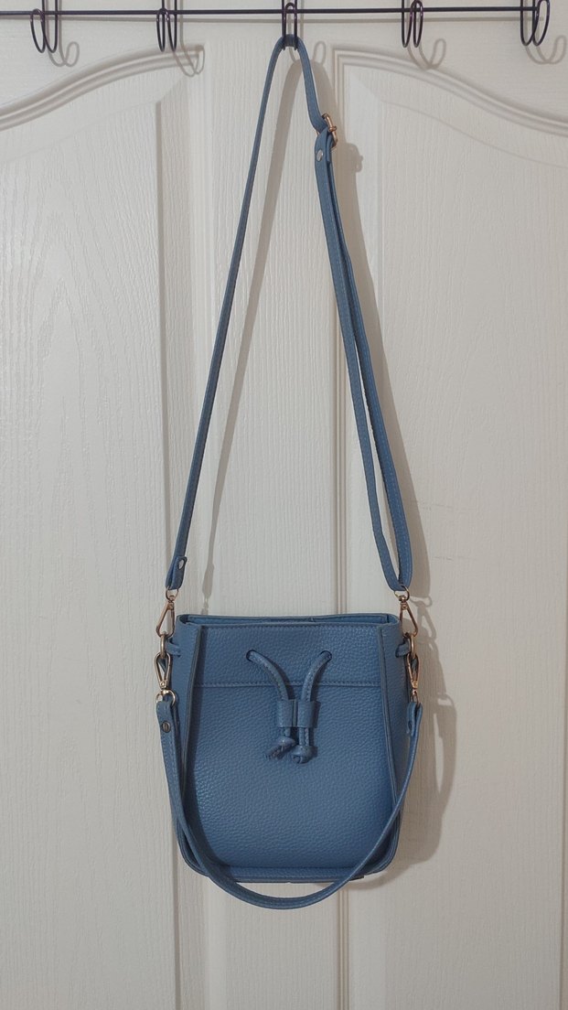 Mavi deri çanta, hem kısa hem uzun olarak kullanılabilir, düğmelidir, sadece kullanıma bağlı olarak renk değişmesi vardır haricinde bir sorunu yoktur.