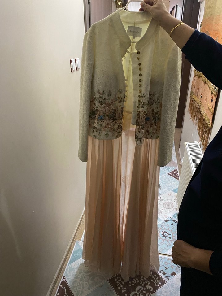 Bej renkli, uzun kollu, nakış detaylı ve düğmeli vintage tarzı kadın ceket rahat kesimi ve klasik zarafetiyle düğünlere uygundur.