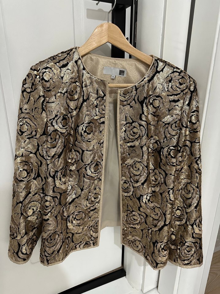 Üzerine oturan kesim vintage kadın ceket. Siyah ve Gold tonlarında, pullu ipeksi dokulu, uzun kollu ve ofis için uygun midi boy ceket.