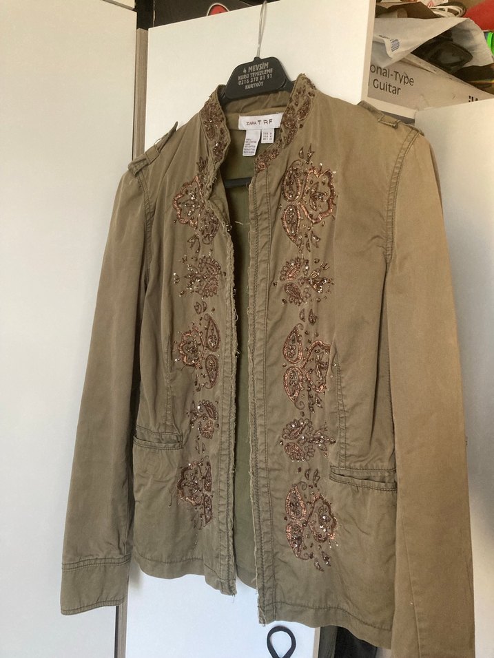 Bej renkli, düğmeli ve uzun kollu kadın ceket. Nakış detayları ve geniş kesimiyle bohem tarzını yansıtıyor. Dokusu parlak ve tekstil malzemeden üretilmiştir.