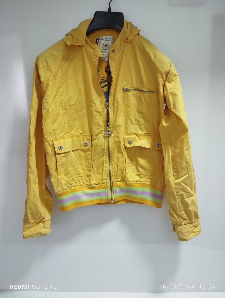 Kapüşonlu, fermuarlı sarı kadın ceket. Yağmurluk tarzında. Kol boyu 77 cm (reglan kol), genişliği 53 cm, astarlı, çıkarılabilir kapüşonlu.