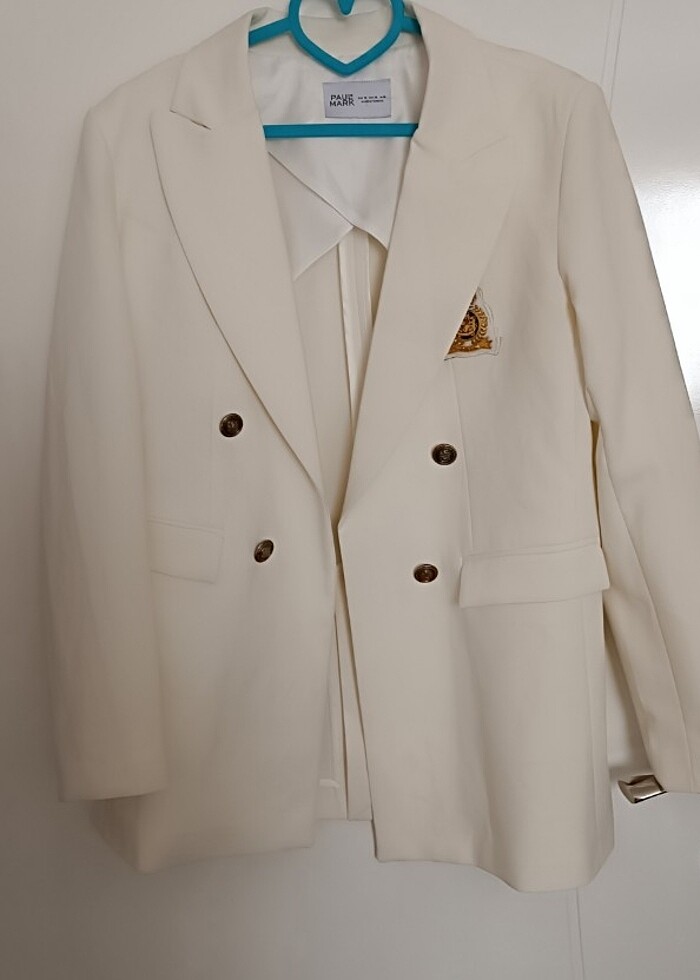 Ekru renk armalı kadın ceket. XL beden alındıktan sonra hiç giyilmedi İki koltukarası ölçüsü: 56cm Omuzdan kalçaya boy ölçüsü:71 cm