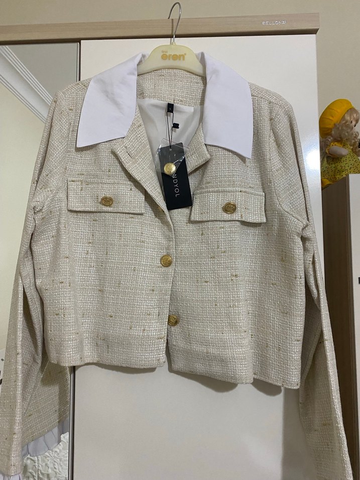 İnce bir kumaşı var astarlı L beden M bedene de olur büyük olmaz Hiç kullanılmadı boyu bel hizasında crop ceket ancak çok kısa değil Düğmeli, kısa kesim beyaz ceket, notched lapel yaka ve uzun kolludur. Sentetik kumaştan üretilmiş, ofis için uygun, trend sokak tarzı sunar.