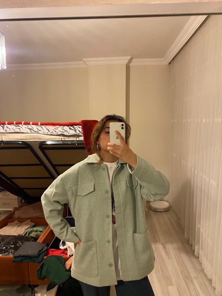 Bol kesim, uzun kollu su yeşili , düğmeli ve çentikli yaka detaylı. Yumuşak ve sıcak kumaştan, günlük rahat kullanım için uygundur.