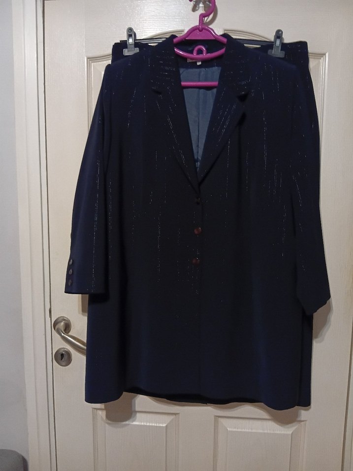 merhaba kadın ceket, etek takım, yeni etiketli ürün 56 beden, çok koyu lacivert renginde,kumaşı sim detaylı, etek arkadan yırtmaçlı, mezura ölçüsü ceket beden iki kol arası 68 cm ,boy uzunluğu 89 cm ,kol boyu 60 cm ,etek mezura ölçüsü bel genişliği 53 cm ,basen ölçüsü 64 cm ,boy uzunluğu 97 cm .