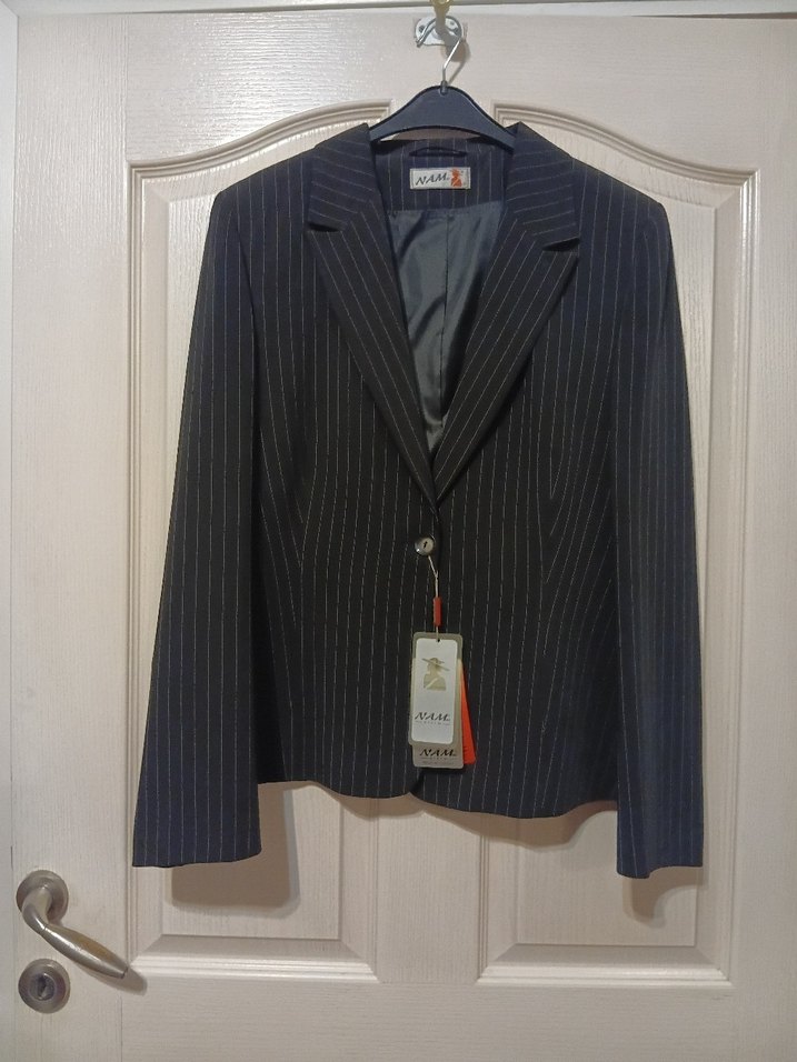 merhaba kadın ceket, etek takım, yeni etiketli ürün, 42 beden renk siyah üzerine ince çizgili, ceket beden mezura ölçüsü iki kol arası 49 cm ,boy uzunluğu 62 cm ,kol boyu 64 cm ,etek mezura ölçüsü bel 44 cm ,basen ölçüsü 51 cm ,boy uzunluğu 100 cm ,etek önden pilili yırtmaçlı şık bir tasarım.