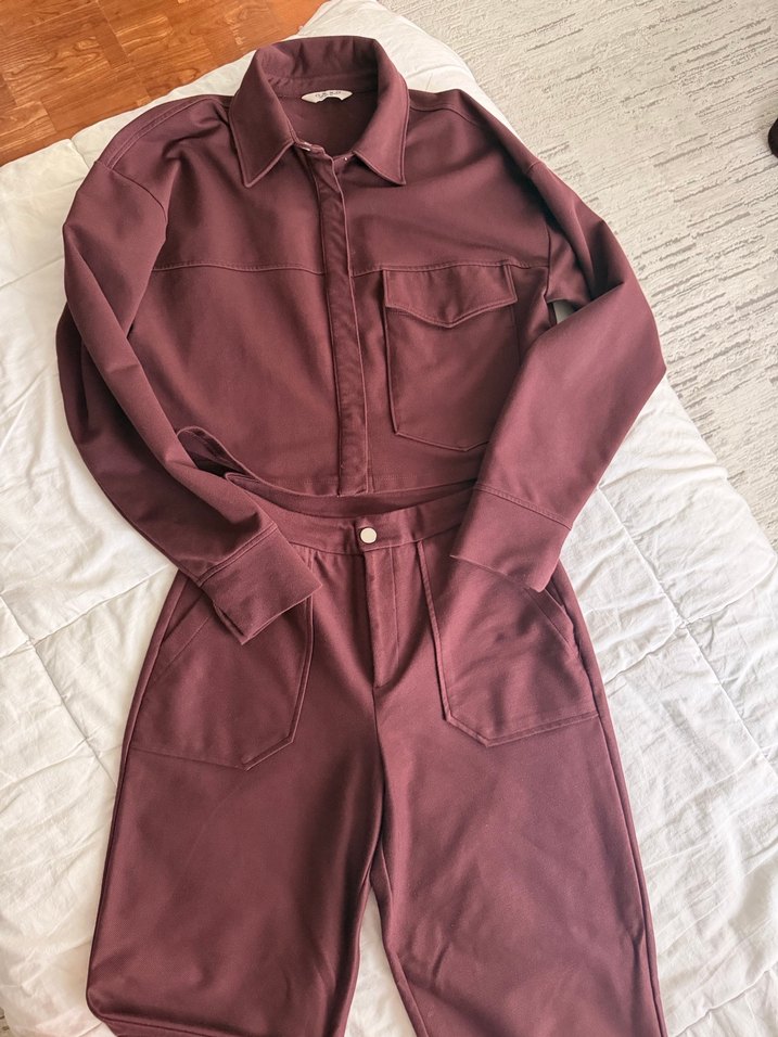 Bordo renkte, düğmeli, uzun kollu ve normal kesim midi kadın takımı. Yumuşak sentetik kumaştan, günlük kullanıma uygun.