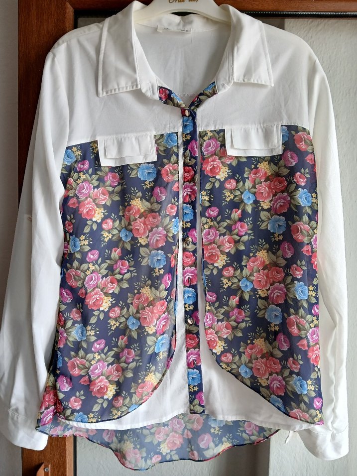 Düğmeli, yakalı ve uzun kollu kadın gömleği. Beyaz kumaş üzerine pastel renklerde çiçek desenli paneller içerir. Bohem tarzda, bol kesim ve midi uzunluktadır Ürün sıfırdır Etiketi koparılmıştır 44/46 Beden Uyumludur Alan kişiye Hayırlı Olsun