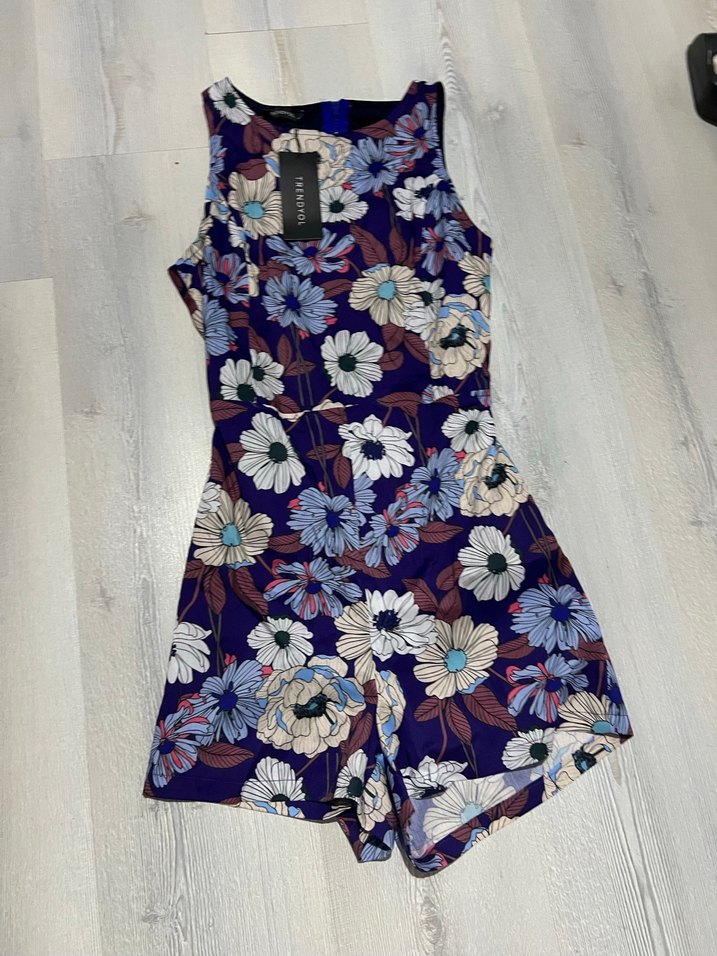 Kadınlar için çiçek desenli, dar kesim, kolsuz kısa tulum. Mor zemin üzerine çiçek deseni, sentetik kumaş, straplez yaka ve dantel detaylıdır. Bohem tarzı için uygundur. S beden, etiketli ürün. Trendyoldan alındı