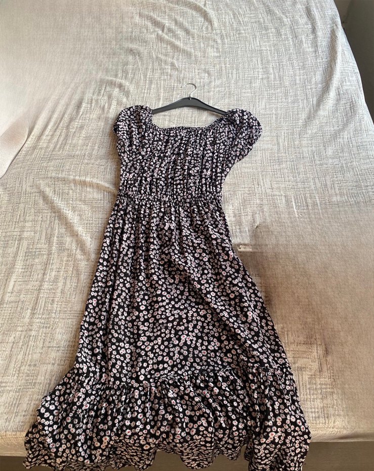 Kadınlar için çiçek desenli, uzun ve bol kesim elbise. Tekne yaka ve kısa balon kolludur, bel kısmı büzgülüdür, rahat bir şıklık sunar.