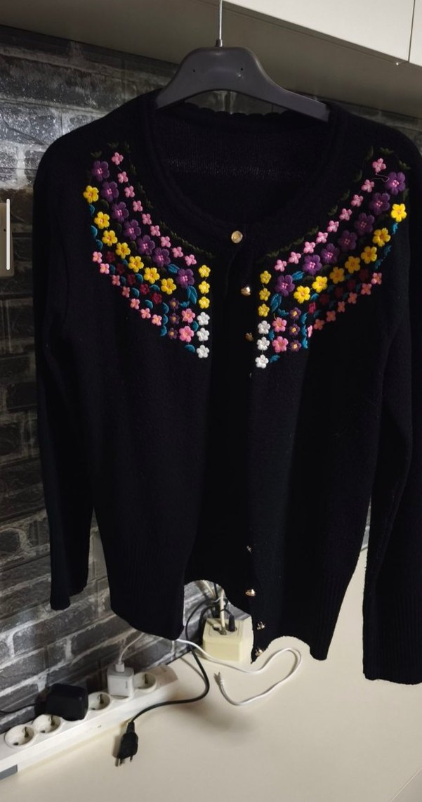 Düğmeli, çiçek nakışlı, yuvarlak yakalı örme bohem hırka. Uzun kollu, günlük kullanım için uygundur. 42/44 beden arası uygundur