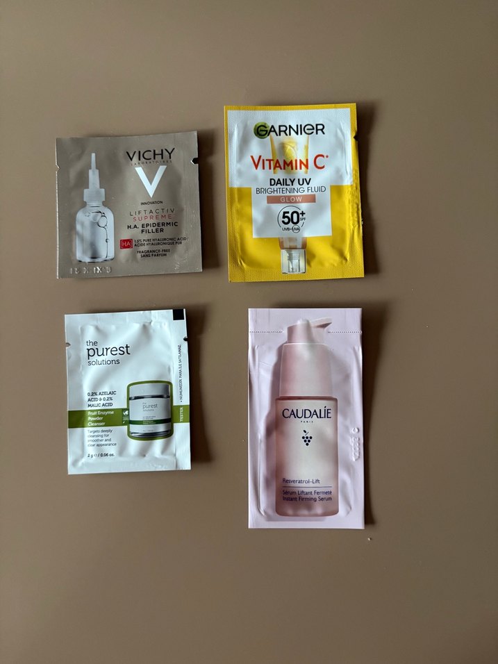 Vichy Liftactiv serum, Garnier Vitamin C SPF 50+ koruyucu sıvı, Purest Solutions nemlendirici ve Caudalie Resveratrol-Lift serumu içeren dört kadın cilt bakım örneği.
