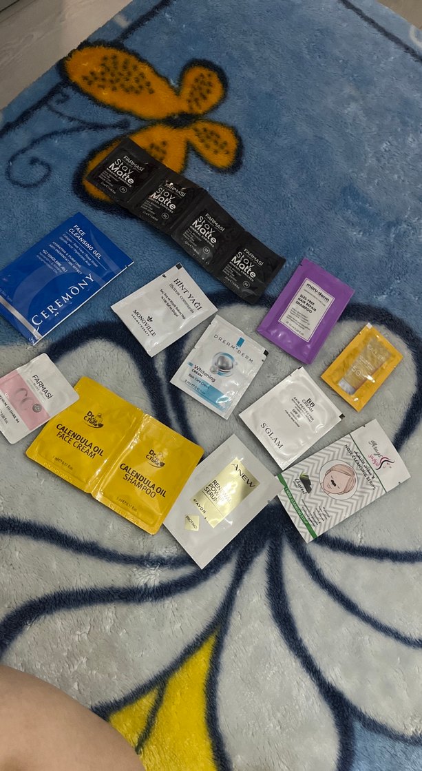 Kadınlar için yüz kremi, şampuan fondoten ve temizleme mendilleri içeren çeşitli cilt bakım ürünleri deneme seti.