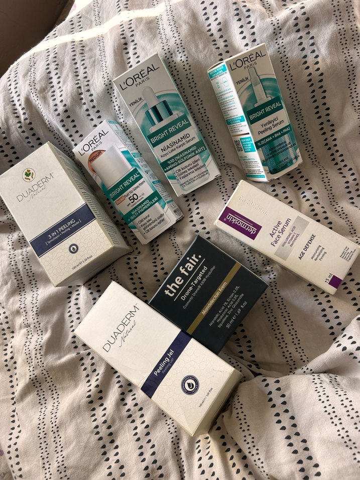 L'Oréal Bright Reveal ve Duaderm marka cilt aydınlatıcı ve bakım ürünlerinden oluşan kadın cilt bakım seti. Serumlar ve peeling işaretlenen yere kadar kullanıldı The fair 3 kez Duaderm yüz yıkama jeli 3 kez kullanıldı Dermoskin kullanılmadı 10/25 tarihli Diğer ürünler kullanılmadı