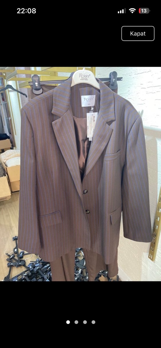 Kadınlar için çizgili, kahverengi blazer ceket, normal kesim ve düğmeli tasarıma sahiptir. Midi boyda, uzun kollu ve ipeksi kumaştan üretilmiştir. PERRY markalıdır.