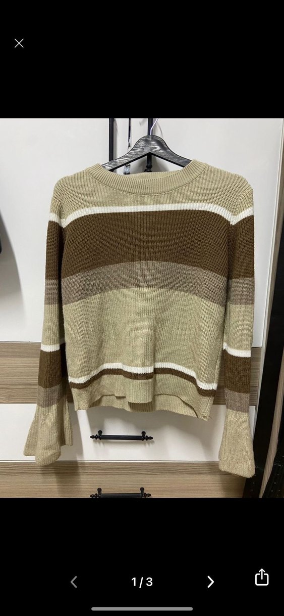 Kadınlar için çizgili, kahverengi ve gri tonlarda örgü kazak. Rahat kesim, uzun kollu ve bisiklet yaka ile günlük kullanıma uygun.