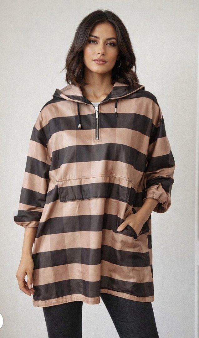 Kadınlar için bol kesim, uzun kollu, yüksek yakalı, fermuarlı ve çizgili desenli kahverengi-gri midi yağmurluk. Günlük rahat stil için uygundur. ☔SON FIYATIDIR S/M