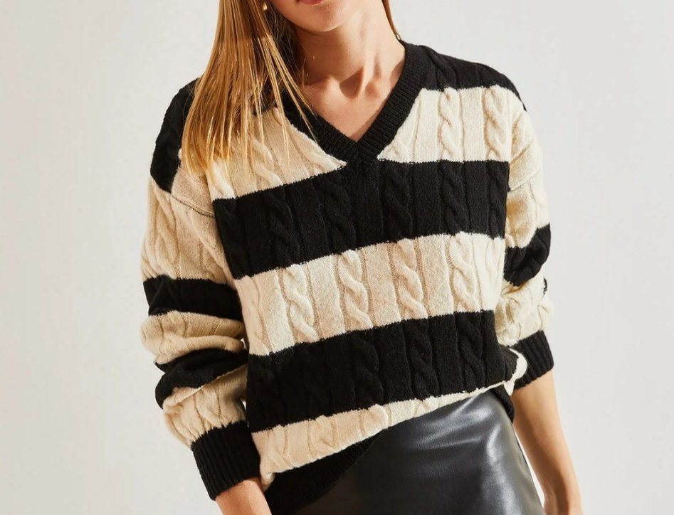 V yaka ve uzun kollu, kadın kazak. Geniş çizgili desenleri,rahat ve günlük sokak stili görünümü sağlar. Standart Beden