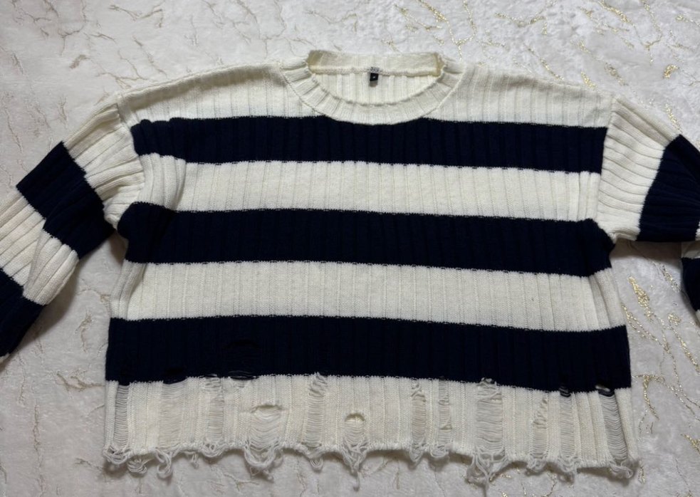 Kadınlar için çizgili, uzun kollu ve yuvarlak yakalı örgü kazak. Bol kesim, yırtık detaylı alt kısmı ile grunge punk tarzını yansıtıyor. Günlük kullanıma uygun.