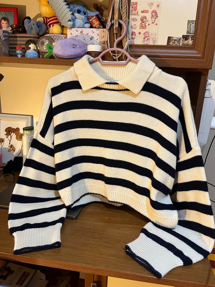 Yeni gibi İki koltuk arası 70 cm uzunluk 46 cm Örgü kumaştan, uzun kollu ve yakalı kadın kazak. Çizgili deseni ve bol kesimiyle rahat, günlük kullanıma uygun bir parça.ki koltuk arasıFiyat s
