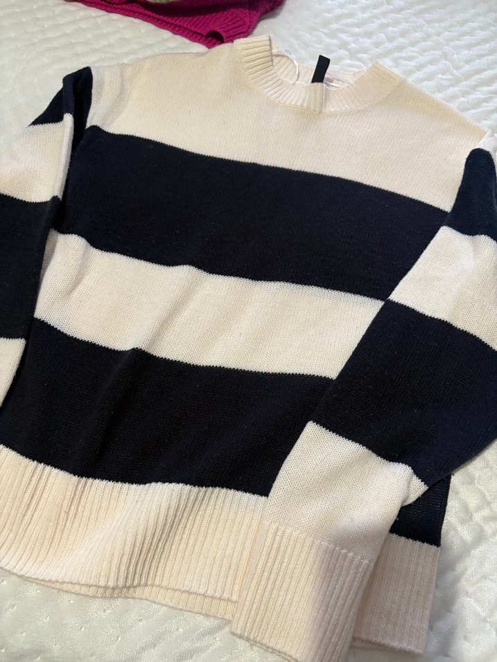 Kadınlar için yumuşak yün örgü, bol kesim, yuvarlak yaka ve uzun kollu kazak. Koyu ve beyaz renklerde çizgili desene sahip, günlük kullanıma uygundur.
