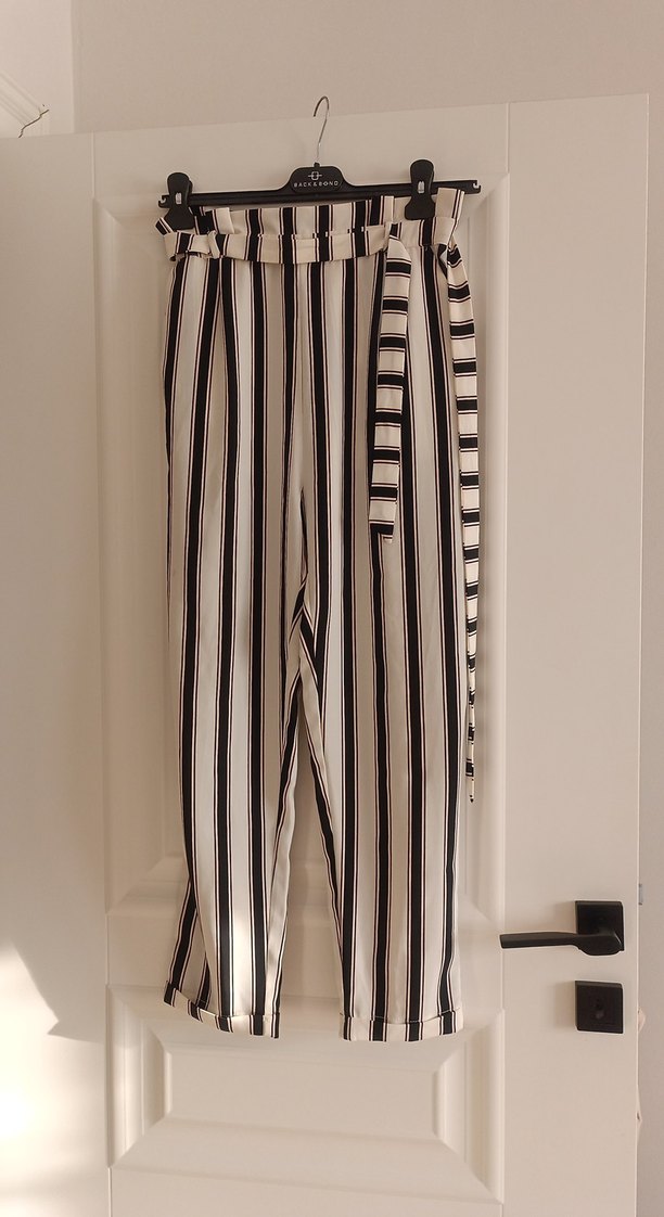 Uzun boy, koyu bej ve siyah çizgili kadın pantolon, pilili ve rahat kesimlidir. Yumuşak satenimsi polyester kumaştan üretilmiş, ofis ve günlük kullanıma uygundur.