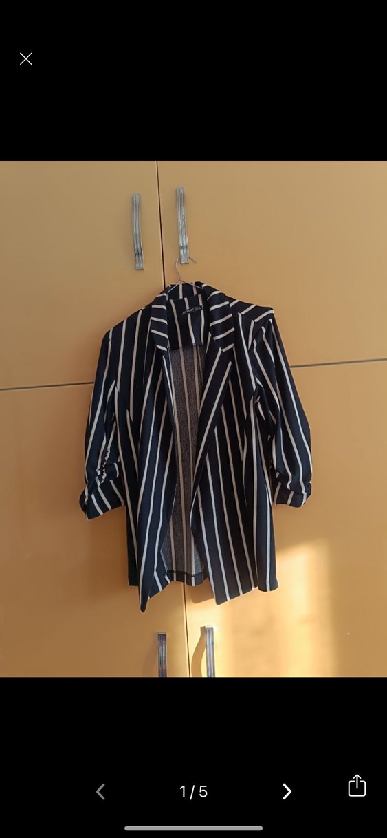 Kadınlar için siyah çizgili blazer ceket, keskin yaka, uzun kollu ve düğmeli detaylara sahiptir. Normal kesim ve midi boydadır, ofis için uygundur.