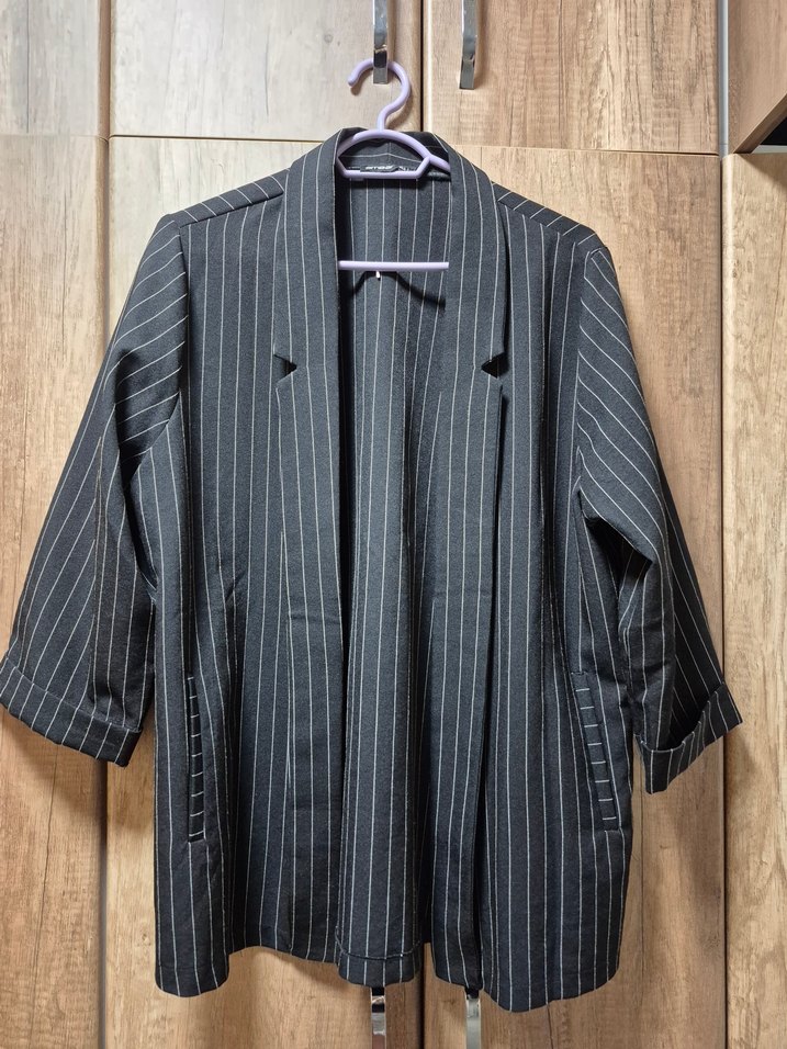 Kadınlar için gri çizgili, keten kumaştan normal kesim, uzun kollu, normal boy midi ceket. Ofis ve iş ortamına uygundur.