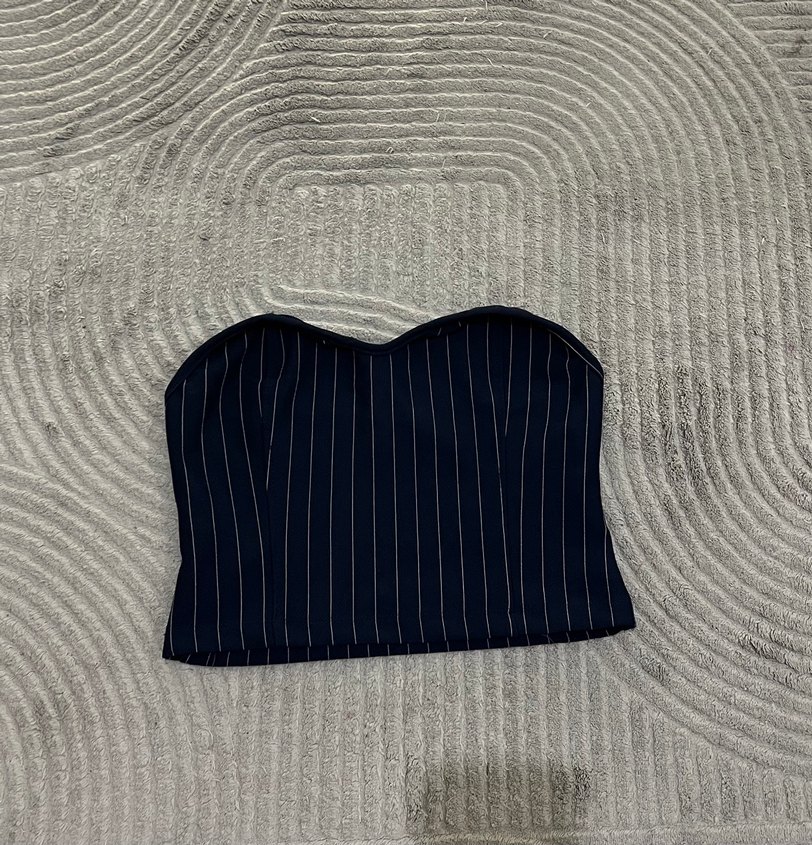Kadınlar için çizgili, straplez ve pileli tasarıma sahip, rahat sentetik kumaştan yapılmış, sokak modasına uygun, günlük kullanıma uygun bustiyer.
