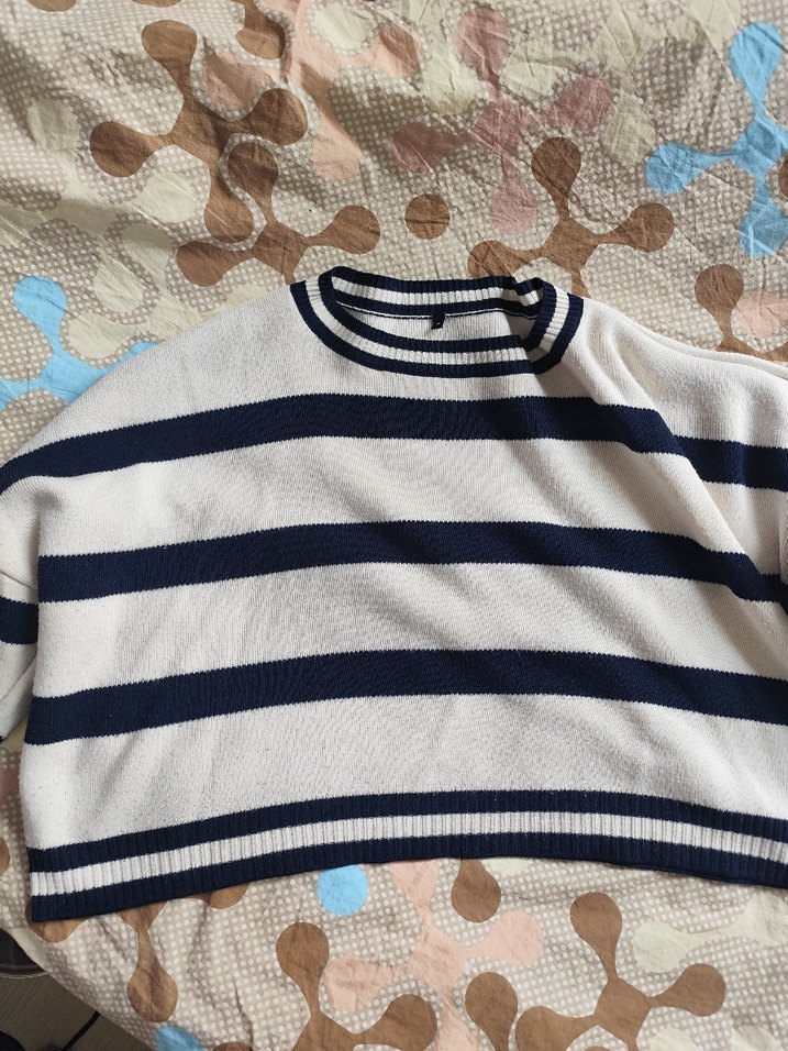 Kadınlar için beyaz ve gri çizgili, rahat kesim uzun kollu triko kazak. Yuvarlak yaka ve yumuşak örme kumaştan üretilmiştir.