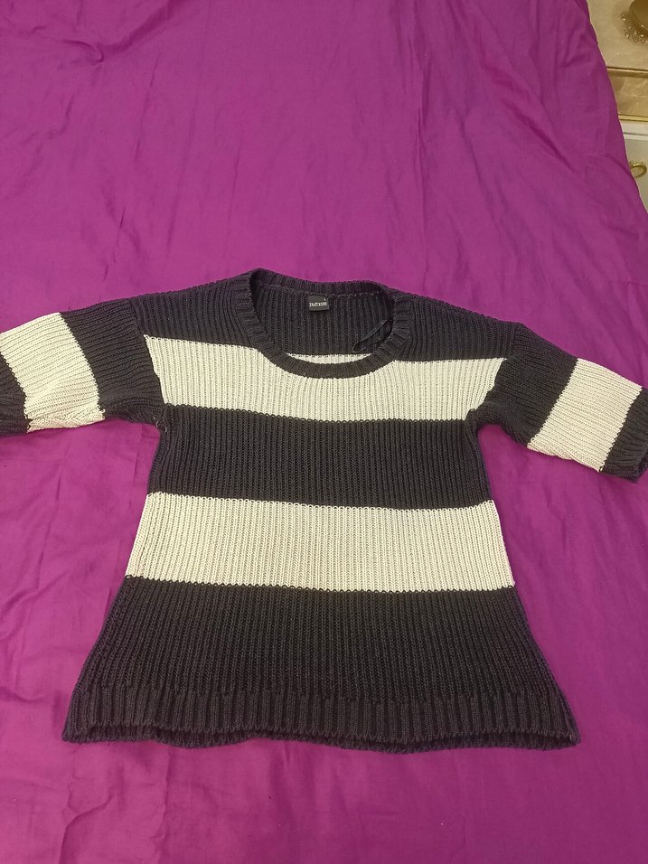 Kadınlar için yarım kollu, yuvarlak yaka, çizgili triko kazak. Rahat kesimi ve yumuşak örgü dokusu ile gündelik ve sokak stiline uygundur.