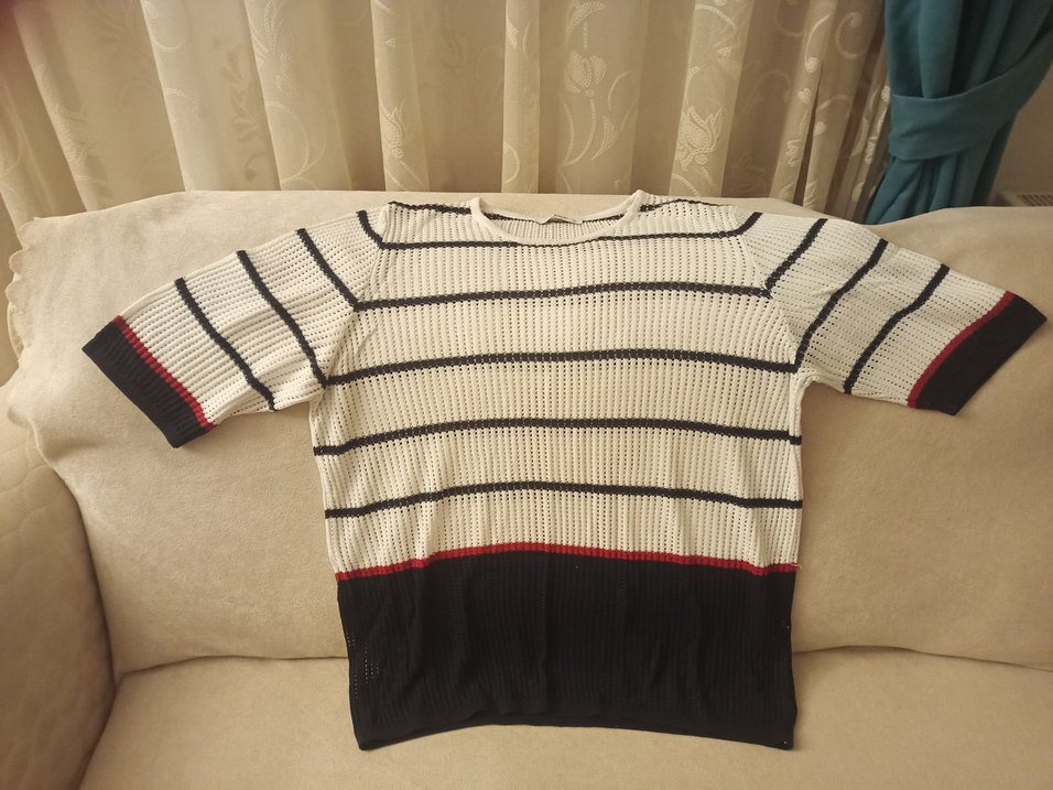 Kadınlar için bol kesim, yuvarlak yakalı triko kazak. Beyaz, kırmızı ve lacivert çizgili, rahat sokak tarzı için uygundur. Kol boyu dirseğe yakın kısa kollu
