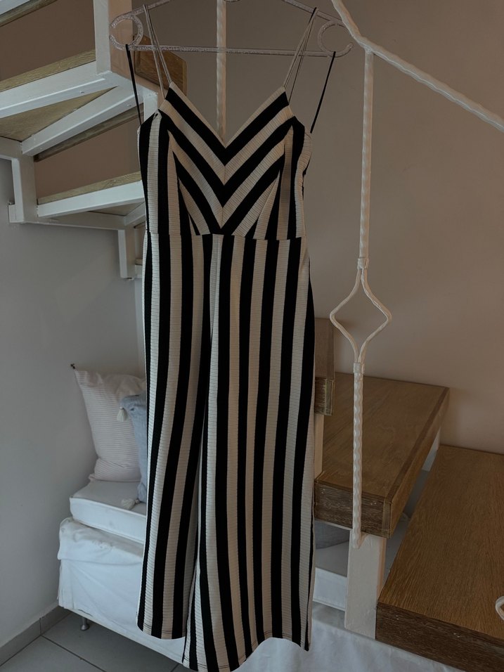 Kadınlar için V yakalı, ince askılı, siyah beyaz çizgili uzun tulum. Düzenli kesim ve pile detaylı, düz sentetik kumaştan, günlük kullanıma uygun.
