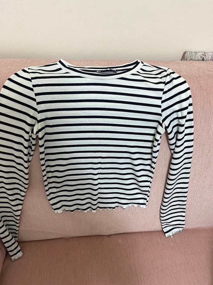 Pamuklu, uzun kollu, çizgili ve yakası tekne yaka olan kadın bluzudur. Fitted kesim ve pileli detaylar içerir, günlük rahat sokak stili için uygundur.