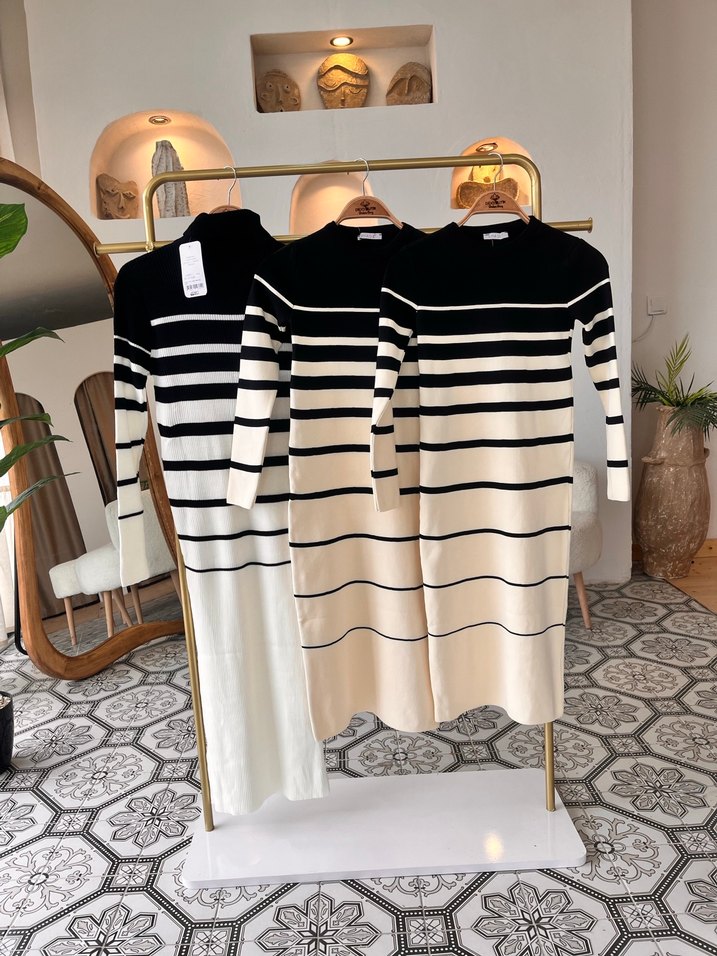Kadınlar için uzun kollu, bisiklet yaka ve çizgili desenli triko elbise. Rahat kesimi ve yumuşak dokusu ile günlük kullanıma uygundur. Hafif renkli, çağdaş Paris tarzında.