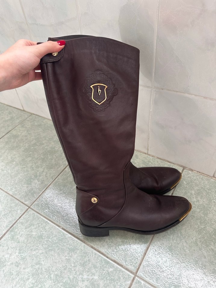 Kahverengi deri dizüstü kadın çizme, sivri topuk ve tokalı detaylarla trendy casual sokak stiline uygun, günlük kullanıma elverişlidir. Görüldüğü gibidir