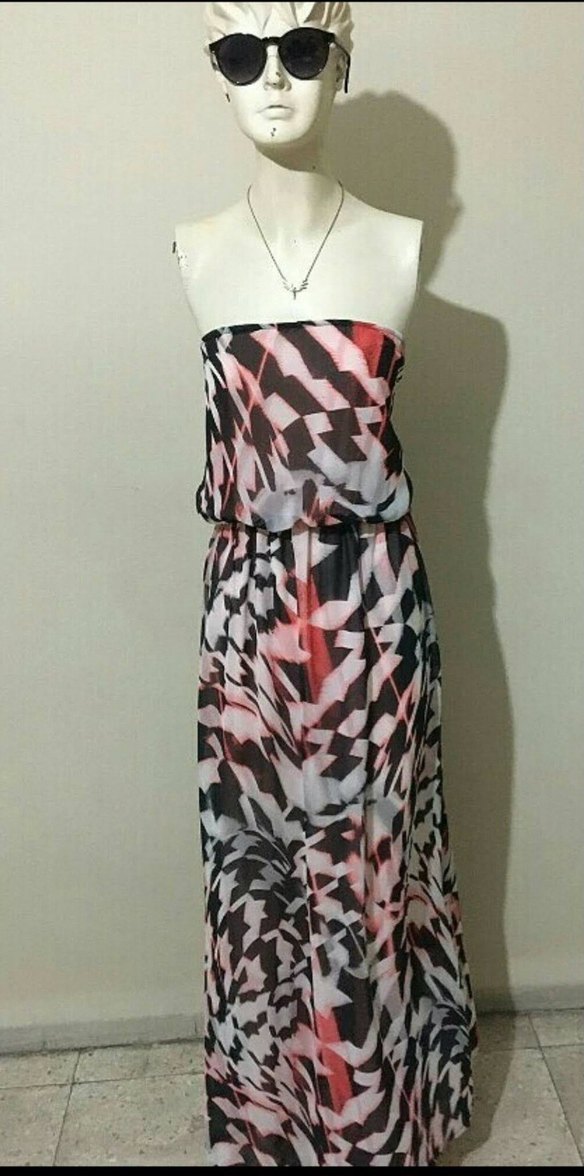 Kadınlar için askısız, bol kesim ve drapeli uzun elbise. Sentetik kumaştan, koyu çok renkli batik desene sahip, dış mekan kullanımı için uygun.