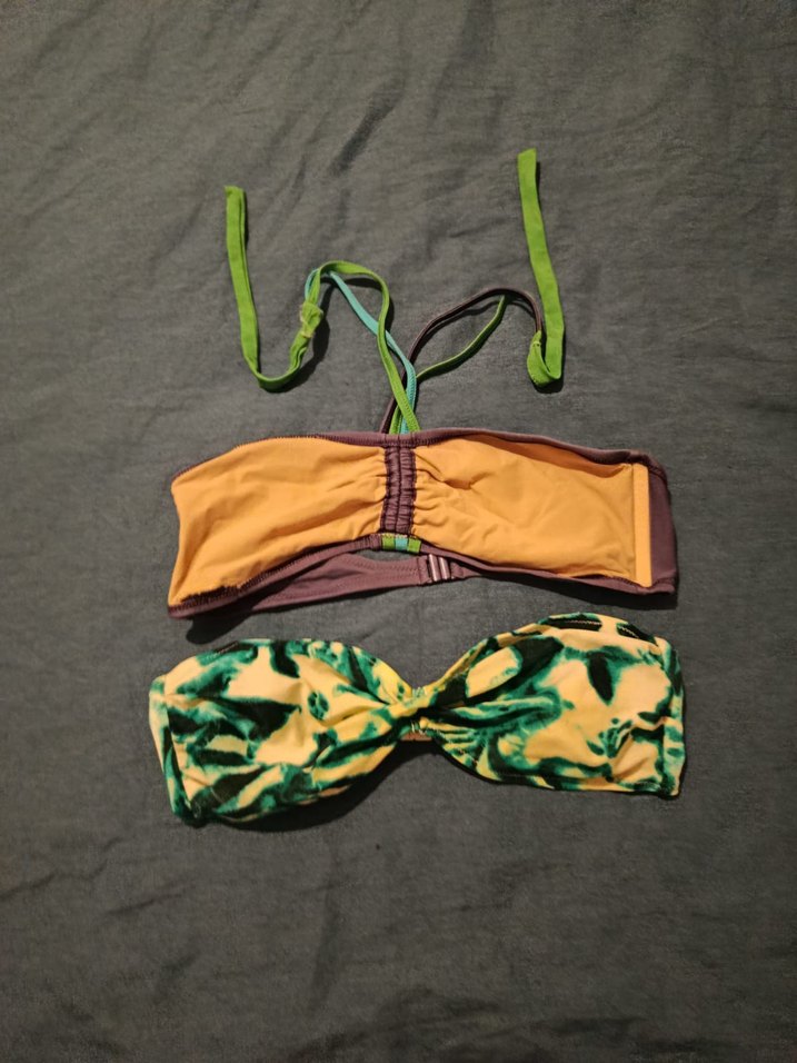 Bağcıklı tasarıma ve karanlık çok renkli batik desenlere sahip, elastik kumaştan yapılmış, kısa uzunlukta, kadınlara özel mini bikini üstleri. Günlük kullanıma uygundur ve bohem ile retro tarzlara uyum sağlar. standart beden