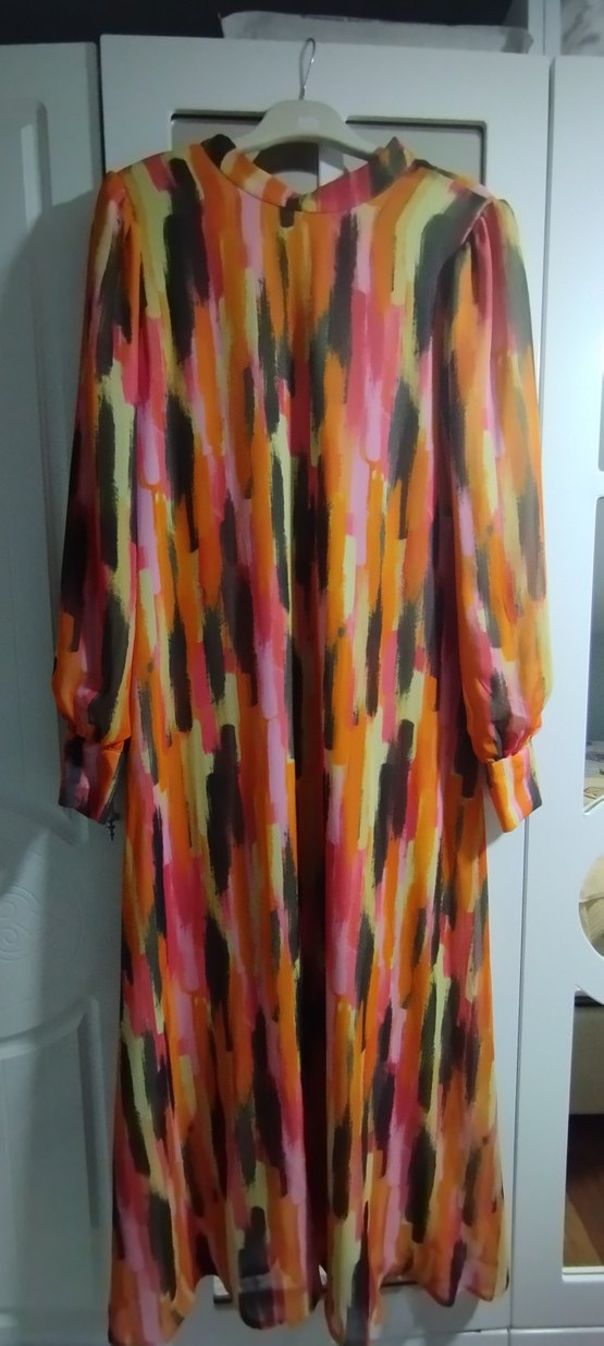 Kadınlar için uzun, bol kesim, uzun kollu ve kayık yaka elbise. Sentetik kumaştan üretilmiş, çok renkli bağlama desenli ve drapeli, bohem tarzını yansıtıyor.