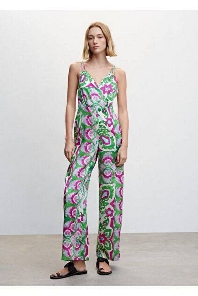 Kadınlar için çok renkli bağlama desenli, dantel detaylı uzun tulum. Kolsuz, V yakalı ve rahat kalıplı, bohem tarzda günlük kullanım için uygun. Ölçüler (düz zeminde ölçülmüştür): • Göğüs: 32 cm • Bel: 30 cm • Basen: 38 cm • İç bacak boyu: 75 cm • Toplam boy: 140 cm Ölçülerde ±1–2 cm fark olabilir.