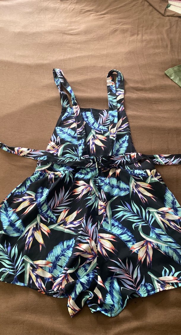 Kadınlar için çok renkli bağlamalı mini tulum, koyu renkli tie-dye desenli, askılı ve straplez yakalı, bol kesim. Tokalı detaylı, bohem ve retro tarzda açık hava kullanımı için uygun.