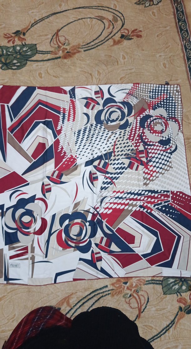 Kadınlar için çok renkli baskılı, retro desenli koyu tonlarda sentetik kumaş eşarp.