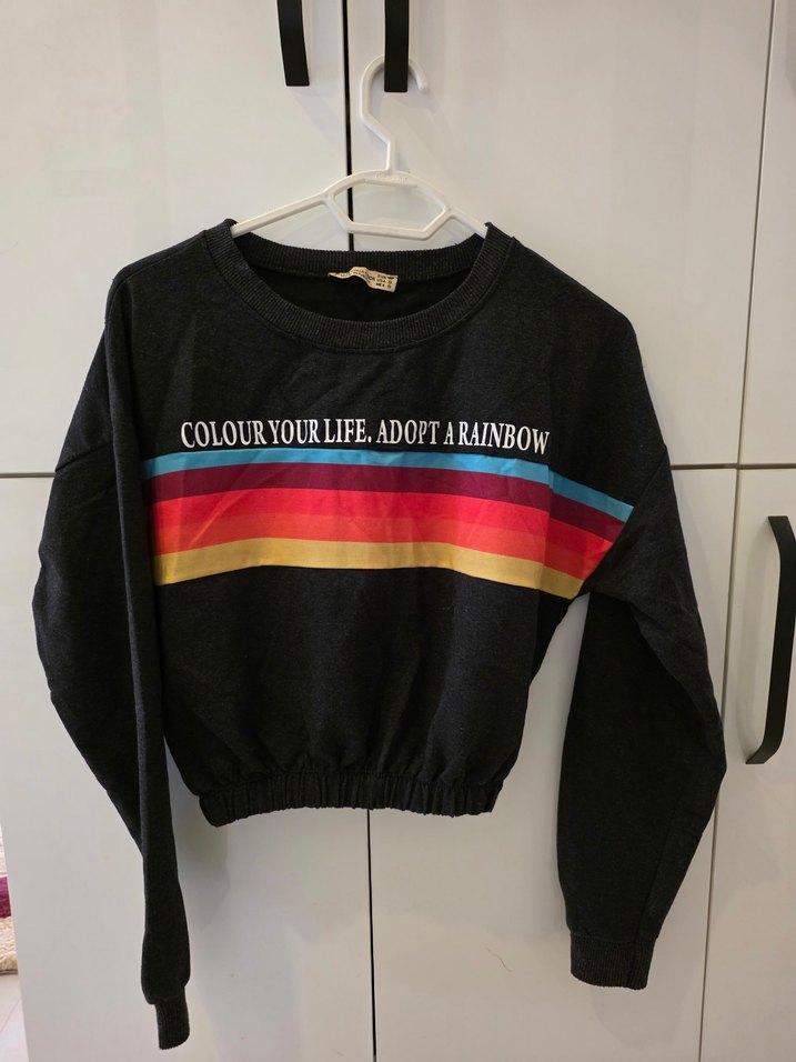 Pamuklu, uzun kollu ve bisiklet yaka olan bu koyu renkli sweatshirt, bol kesimdir. Önünde "COLOUR YOUR LIFE. ADOPT A RAINBOW" yazılı çok renkli baskı bulunmaktadır.