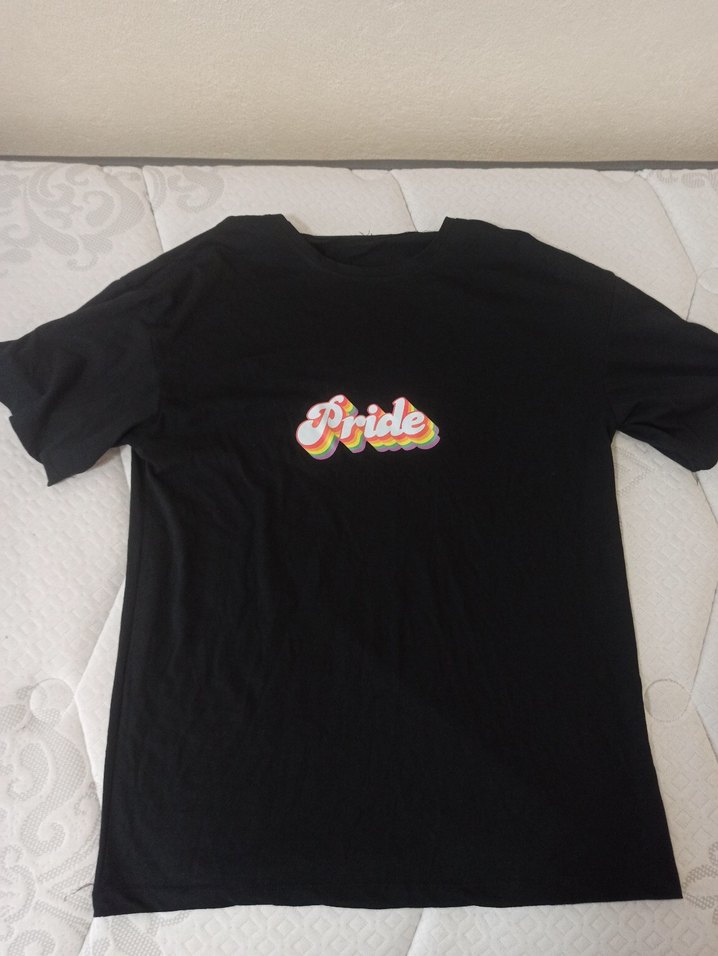 Kadınlar için kısa kollu, yuvarlak yakalı ve bol kesim tişört. Sentetik kumaştan yapılmış, koyu renkli ve çok renkli "Pride" baskılı, günlük veya parti için uygun.