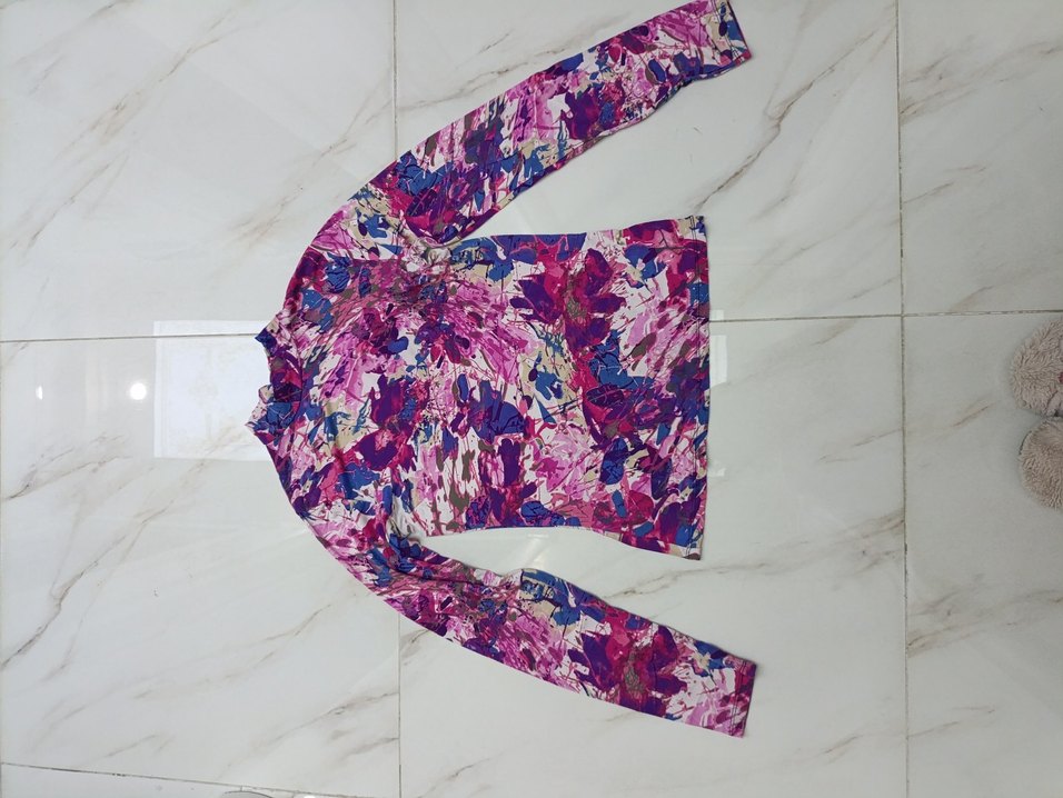 Kadın çok renkli batik desenli, uzun kollu, balıkçı yakalı, vücuda oturan bluz. Rahatlık için elastik detaylı, günlük kullanım için uygun.