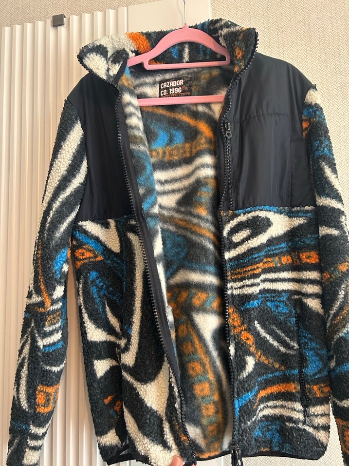 Kadınlar için bol kesim, yüksek yakalı ve uzun kollu ceket. Yumuşak ve sıcak kumaştan, koyu çok renkli batik desenli ve fermuarlı, dış mekan kullanımı için uygun.