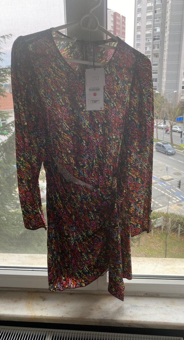 Kadınlar için çok renkli batik desenli, uzun kollu ve bol kesim midi elbise. Sokak modasına uygun şık bir parça.
