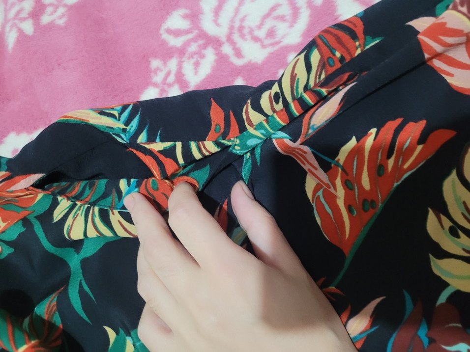 Kadınlar için düğmeli ve batik desenli çok renkli koyu tonlarda pantolon . Bohem tarzda günlük kullanıma uygun.
