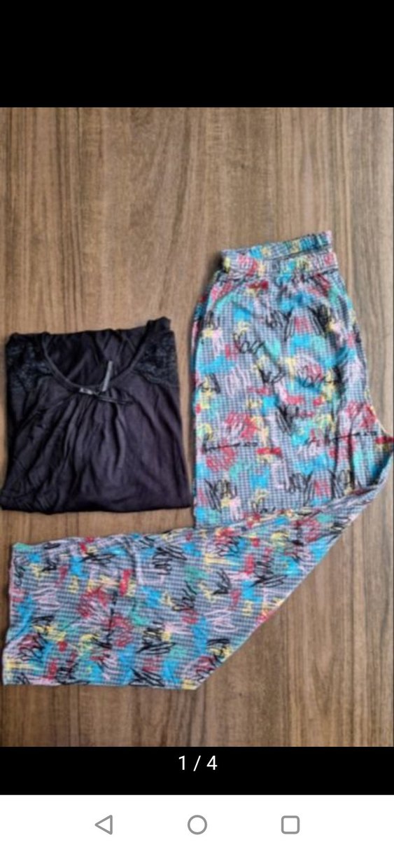 Kadınlar için salaş kesim, kolsuz koyu üst ve çok renkli batik desenli uzun pijama altından oluşan rahat pijama takımı.