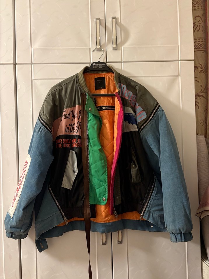 Kadınlar için bol kesim, bel detaylı, çok renkli baskılı desenlere sahip denim ceket. Notlu yaka ve askılı kollarıyla grunge punk tarzını yansıtır. Gri ve çok renkli tonlarda, midi boyda gündelik kullanıma uygun. Geçen sezon bir butikten almıştım aşırı zayıfladım artık kendime yakıştırmıyorum yoksa çok sevdiğim bir ceket (bir cebi delik sadece)